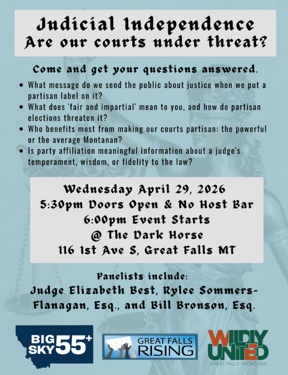 You are cordially invited to attend Judicial Independence: Are Our Courts Under Threat? on Wednesday, April 29, 2026, at The Dark Horse, 116 1st Ave S, Great Falls, Montana. Doors will open at 5:30 p.m. with a no-host bar, and the program will begin at 6:00 p.m. This timely discussion will examine the importance of maintaining fair and impartial courts, the implications of partisan influence in judicial elections, and the broader impact on public confidence in the justice system. The evening will feature a panel including Judge Elizabeth Best, Rylee Sommers-Flanagan, Esq., and Bill Bronson, Esq.